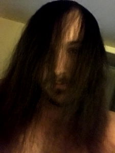 The image features a person with long hair, presumably male based on the hairstyle and facial hair. He is wearing no shirt and has a full beard. His gaze is directed towards the camera. The background is simple and does not provide any additional context about the location or setting of the photo.