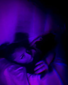 This image depicts a purple and black themed photo of an OnlyFans model with a silhouette effect. The model appears to be relaxed in a bedroom environment, with a vibrant atmosphere created by the color scheme.