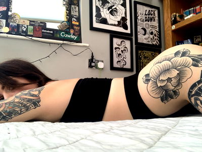 A sultry and alluring photograph of the OnlyFans model Badmoon, captured in a moment of relaxed elegance. This image showcases her unique tattoos, confident pose, and the intimate connection with the viewer.