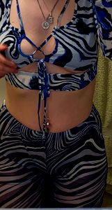 The image features OnlyFans model El in a candid pose, showcasing a stylish outfit and accessories. The attire includes a cropped tank top with a unique pattern paired with high-waisted pants that add a fashionable touch to the ensemble. Accessories like a chain necklace and a zebra print belt contribute to an edgy look. El's pose suggests confidence and style, making this an interesting image for fans of the model.