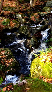 This image depicts a serene waterfall cascading through a verdant forest. The surrounding area is lush with autumnal colors, and the small stream leading to the falls adds a sense of tranquility. A wooden footbridge can be seen in the distance, inviting visitors to explore the natural beauty.
