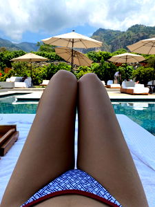 A picture of Emma enjoying the sun while lounging on a yacht. She is wearing a bikini and sunglasses, creating an atmosphere of relaxation.