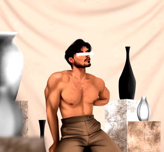 This image captures a muscular man in his prime, his age estimated to be around 30, exhibiting a chiseled physique. His bare chest is visible, revealing well-defined muscles, including his chest, abdomen, and shoulders. His abdominal muscles are particularly prominent, displaying a clear cut six-pack. The man's face is also clearly visible, featuring a well-groomed beard that adds to his rugged appeal. His elbows are partially visible, adding a dynamic sense to the image. The man is shirtless, wearing only an undergarment, which allows for a full view of his upper body. His skin tone is fair, indicating that the photograph was taken indoors against a wall backdrop. The man's neck is also visible, showing strong neck muscles that complement his overall well-built physique. He appears to be a bodybuilder or someone who is heavily into fitness and body conditioning. The image exudes a sense of muscular strength, determination, and masculinity.
