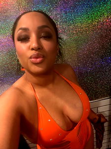 Egyptian Kitty, a stunning model in an orange swimsuit, is captured in a mirror selfie. Her pose is confident and playful, set against the backdrop of a disco ball.
