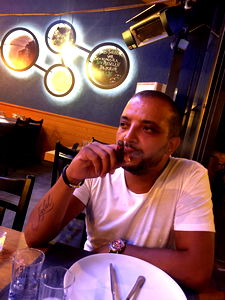 The image captures a moment in an indoor dining area, where a man is seated at a table and appears to be enjoying a meal. The setting suggests a casual dining environment with the focus on the man, who seems relaxed. There are various elements of interior decor visible in the background, contributing to a comfortable ambiance.