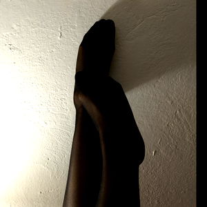 A person's leg clad in black stockings against a white wall. OnlyFans model name: Sammy.