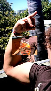 A fitness enthusiast showcasing a flexing bicep. A lively scene with palm trees and a blue sky, suggesting a sunny day.