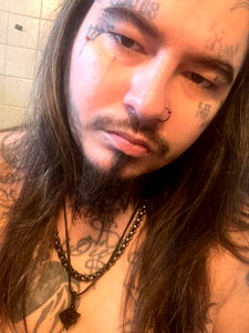 A bearded man with long hair and tattoos. He is seen sporting a necklace and a beard. He seems to be in a good mood as he smiles at the camera. Onlyfans model name Jerrod Money Cook.