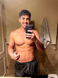 Elijah Watz, a prominent OnlyFans model, is seen taking a mirror selfie. He's shirtless and has a confident expression on his face as he captures this moment.