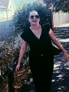 This is an image of EllieLou, a model, captured mid-stride as she walks down the sidewalk. She is dressed in a black dress and has sunglasses on her face. The photo seems to be taken during the day under clear skies.