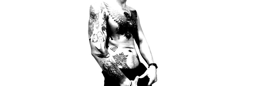 A young man flexing his tattooed physique, showcasing his unique style and sense of humor. Aged 23 years old with a flair for unconventional fashion and bold body art.
