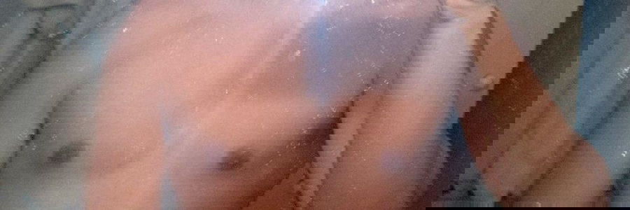 A man is shirtless in a bathroom, standing in front of a mirror with his hands behind him. His reflection shows no clothing on his upper body. He appears to be looking at the camera.