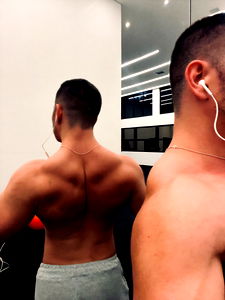 Emanuel, a fitness model from Buenos Aires, Argentina, is captured in his bathroom. He's dressed in gym wear and strikes a pose for the camera. His physique is a testament to his dedication to health and fitness.