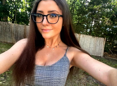 OnlyFans model Emily Ellis captures attention with her striking gaze and trendy style. She is seen in a playful pose, holding up a peace sign and flaunting her fashionable glasses and blue checkered top. Her long hair adds to the allure of this social media star.