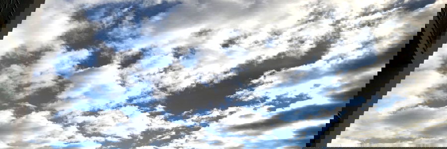 A photograph of a sky filled with fluffy white clouds against a backdrop of a grayish-blue horizon. Emmy S is seen peeking from behind the lens, capturing this serene scene.