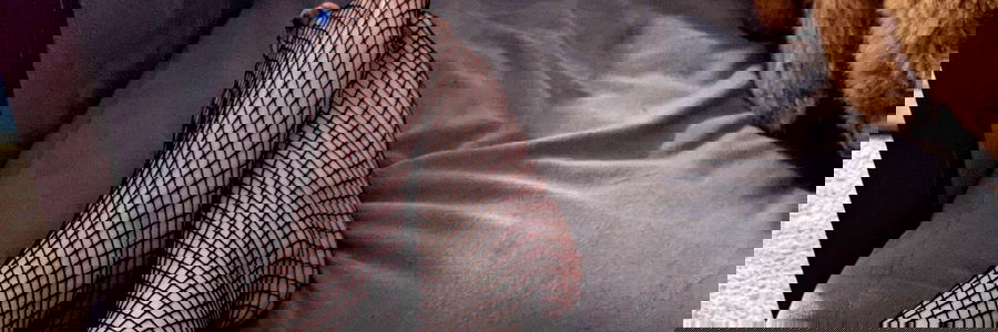 Yvonne Georgia, a popular model on OnlyFans, is captured in a seductive photoshoot. She's posing on a grey couch, wearing a black fishnet stockings and high heels. Her body language suggests she's comfortable and confident in her lingerie. The image exudes an air of sensuality and allure, characteristic of Yvonne Georgia's content.