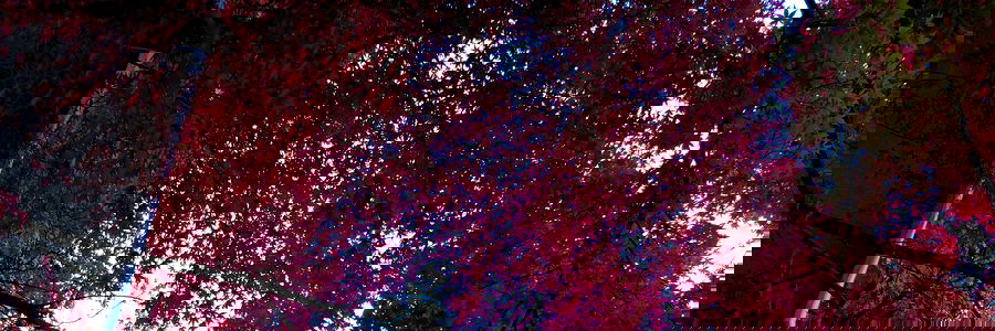 A seasonal photograph capturing a blurry model against a backdrop of red maple leaves and urban architecture. It exudes a warm autumn vibe.