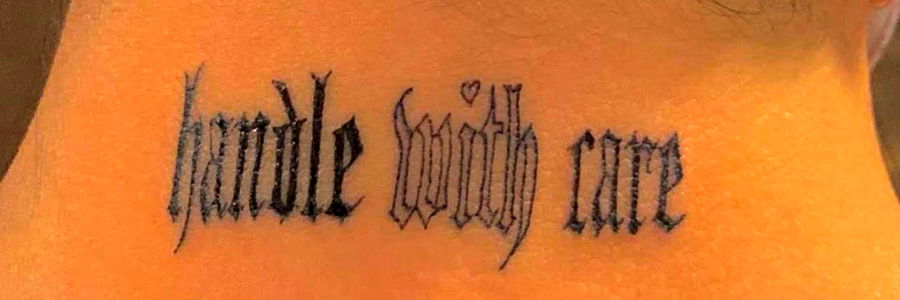 A highly detailed tattoo on a woman's wrist, showcasing the intricate artistry of erqtica. The tattoo features a banner with the words 'Handle With Care'.