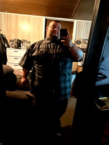 The image shows an individual taking a mirror selfie. He is wearing casual attire and has tattoos visible on his arms. The setting appears to be an interior room with various items around, including a television screen. There are no other individuals present in the photo.
