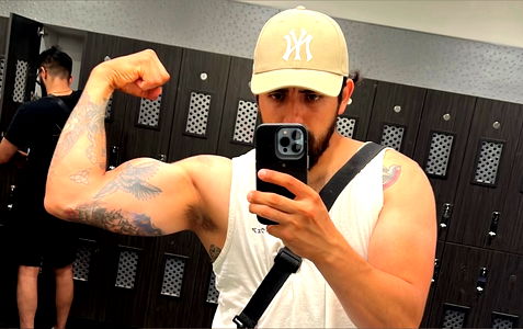 Esnetomon, an Onlyfans model, flexing his muscles and showing off his fitness physique. He is in a well-lit gym locker room.