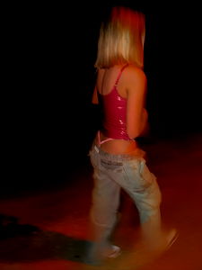 The image appears to be a promotional or professional photograph, featuring a model wearing a red transparent top, jean pants, and sneakers. The model is holding onto their thighs with both hands and has short blonde hair. In the background, there's an urban setting with a dark street and a handrail visible. The model is posing in a way that suggests they are in mid-stride, which adds dynamism to the shot. This photo may be used for promoting an OnlyFans account or as part of a marketing campaign related to fashion or lifestyle content. Please note that this analysis is based on the visual content and available metadata without identifying the individual.