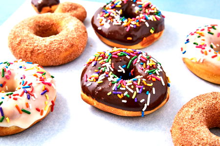A mouth-watering assortment of chocolate donuts topped with colorful sprinkles and a drizzle of rich chocolate. Perfect for any occasion.