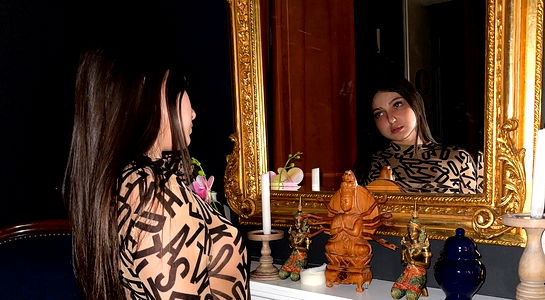 This image showcases a young woman, approximately 22 years of age, engaged in a professional indoor photo shoot. The woman has a model-like appearance, suggesting that she may be an art model or a fashion model. She is posing against a wall, which serves as a simple yet effective backdrop, allowing her to be the primary focus of the shot. She is wearing a brassiere, an undergarment typically associated with lingerie, specifically a lingerie top. The garment reveals her toned abdomen and navel, highlighting her well-maintained physique. This clothing choice, along with her confident pose, adds a sensual element to the image. A striking feature of the woman is her long hair, which cascades down her shoulders, adding an element of grace and femininity to her overall look. Her face, the primary focal point of the image, is clearly visible and expressive. As an accessory, she seems to be wearing a fashion item, though its specifics are not clear. Overall, the image appears to be a blend of fashion, art and a subtle display of the female form. The woman's posture and attire suggest confidence and elegance, making it a captivating image.
