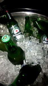 A refreshing display of cold beer bottles, arranged neatly in a large bucket. The beer bottles are placed on ice for maximum chilling effect.