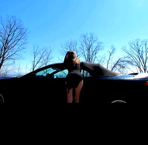 A stunning model poses with a black car, leaning on the vehicle in a stylish manner. Her outfit is casual yet fashionable, with her sunglasses adding an air of mystery and style. This photo captures the essence of the modeling industry and the allure of high-end cars. The backdrop of the image is urban, suggesting a city street setting.