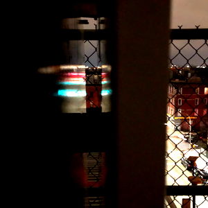 This image captures the serene atmosphere of a city street at night, featuring a chain-link fence, streetlights illuminating the darkness, and a glimpse into the urban environment. It's an interesting perspective that showcases the quiet side of city life after the hustle and bustle of the day.