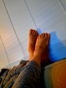 This is a casual and candid photo of someone taking a break by putting their feet up on the windowsill. The person appears to be at home, possibly enjoying some downtime after a long day or during leisure time. The image captures a moment of relaxation, with the person's legs crossed and ankles resting against the window. The room is well-lit, suggesting that it might be evening or daytime depending on the lighting conditions. This could be seen as a snapshot of everyday life.