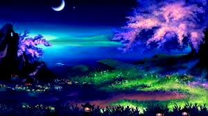 A serene night scene featuring a tranquil lake under a dark sky. In the distance, a large cherry blossom tree stands tall, illuminated by floating lanterns that add a magical touch to the peaceful atmosphere. The calm water is dotted with rocks and surrounded by lush greenery, creating a picturesque landscape perfect for relaxation and contemplation.