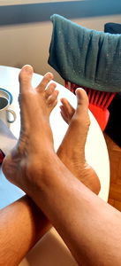 The image depicts a person's feet, showcasing their pedicure and foot position. The model appears to be a man based on the visible anatomy. The photo is taken from an elevated angle, focusing on the lower legs and feet.