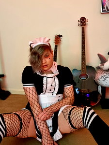 A person dressed as a maid with a punky twist, including an eye patch, posing confidently for the camera. The setting is casual, with a guitar visible in the background. The individual appears to be in their late teens to mid-20s.
