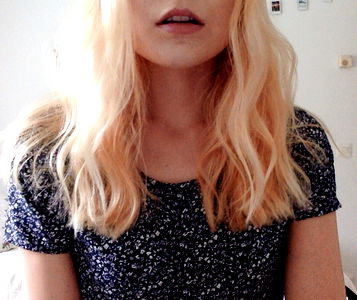 An image of a young woman with blonde hair, blue eyes, and pink lips. She is wearing a white top. The background suggests an indoor setting.