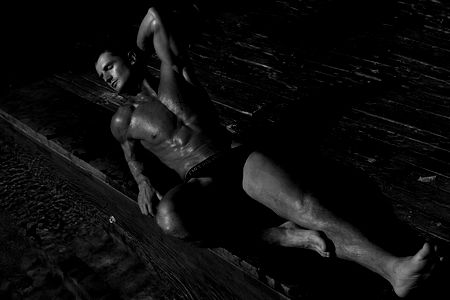 This image captures a young man estimated to be around 28 years old, striking a pose outdoors under a vast sky dotted with clouds. He is the central figure in the composition, filling a significant portion of the frame. The man, caught in mid-action, exudes a sense of vitality and strength, emphasized by his muscular physique. His outfit choice is casual yet stylish, consisting of a pair of classic blue jeans and a piece of clothing that leaves his robust shoulders, chest, and elbow visible, which further accentuates his muscularity. His face, a blend of youthful energy and stoic masculinity, is a prominent feature in the image, drawing the viewer's attention. The backdrop of the image might suggest a beach setting, but it's not entirely clear. The overall atmosphere of the image is vibrant, creating a visually appealing contrast between the man's dynamic figure and the serene sky. It's a captivating portrayal of youthful strength against a naturally beautiful setting.