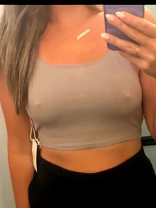 Nicole showcases her fashion sense with a casual yet trendy outfit. The olive green crop top paired with black pants creates an effortless yet stylish look. She poses confidently, making the most of the mirror reflection.