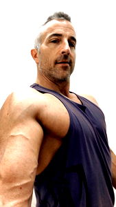 This image showcases a physically fit man, seemingly in his mid-forties, showcasing his well-maintained physique. He is bare-chested, revealing his muscular chest, shoulders, and arms. The man's elbow and shoulder joints are well-defined, highlighting his physical fitness and commitment to bodybuilding. His face, centered in the image, displays a certain determination and focus. The face is visibly mature, consistent with his estimated age, adding a sense of wisdom and experience to his robust physical presence. His neck, like the rest of his visible upper body, is toned, implying a holistic approach to his fitness regime. He is wearing blue clothing, although it is only partially visible in the image. This suggests that the man may be in a gym or fitness environment, further reinforcing the theme of health and physical fitness. The overall impression is of a disciplined individual dedicated to maintaining a high level of physical fitness and strength.