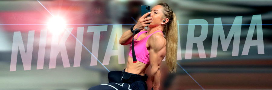 This is an image of a bodybuilder in athletic wear. She appears to be in her mid-twenties with a muscular build and is taking a selfie in front of a gym setting. The text overlay on the photo suggests that Nikita is a fitness influencer, and she has just finished a workout, as evidenced by the visible sweat and the sports bra she's wearing.