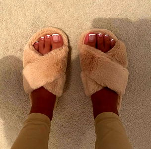 The model is a professional from LA who specializes in footwear. In the image, they are wearing a pair of soft, light brown slippers that appear comfortable and cozy. The toes are painted with a simple, clean design, suggesting attention to detail and personal style.
