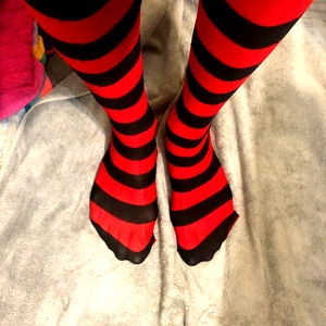 Discover the unique, dark-edged streetwear style inspired by the urban gothic scene. This ensemble features black and red striped leggings, a striking red and black striped top with exaggerated sleeves, paired with black knee-high socks. Accentuate the look with bold red accents. OnlyFans model FoxInstockings is wearing this outfit in Florida.