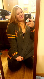 Onlyfans model Foxxi showcasing her outfit. She is wearing a Hogwarts school uniform and has pierced lips.