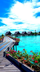A lively beach scene featuring a colorful boardwalk leading towards the ocean, surrounded by tropical plants. This location appears to be popular for relaxation and leisure activities.
