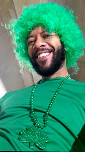 A man poses for a photo in a festive green wig and outfit, complete with shamrock accessories.
