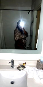 In this stunning image, OnlyFans model Big Domo takes center stage in a hotel bathroom. She's captured in a mirror selfie, exuding confidence and allure. Her outfit is a blend of casual elegance, her pose suggests a moment of tranquility amidst the busy schedule of being an influencer. The background reveals the clean and well-maintained bathroom, adding to the overall aesthetic of the photo.