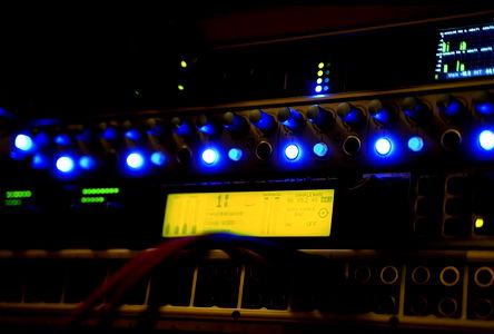 Featuring a state-of-the-art mixing console, this studio is equipped for high-quality audio production. The engineer sits in front of the large console, ready to create music or sound effects.