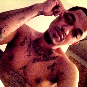 A dynamic and engaging photoshoot of Fresh, showcasing his unique style. The image captures the model from a slightly elevated angle, emphasizing his muscular physique. The tattoos add an edgy touch to the overall aesthetic.