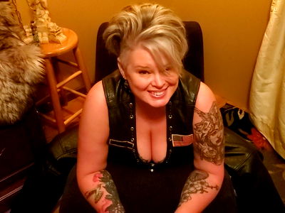 Model from Onlyfans. Freyaschild69alt in a leather biker outfit, proudly displaying tattoos.