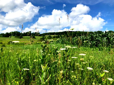A picturesque countryside scene, featuring a field of flowers under a bright sky, with a clear view of a farm in the background.