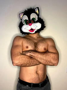 A model poses in a photo shoot with a feline head costume and no shirt on. He is striking a pose against a light background, likely for an OnlyFans project.